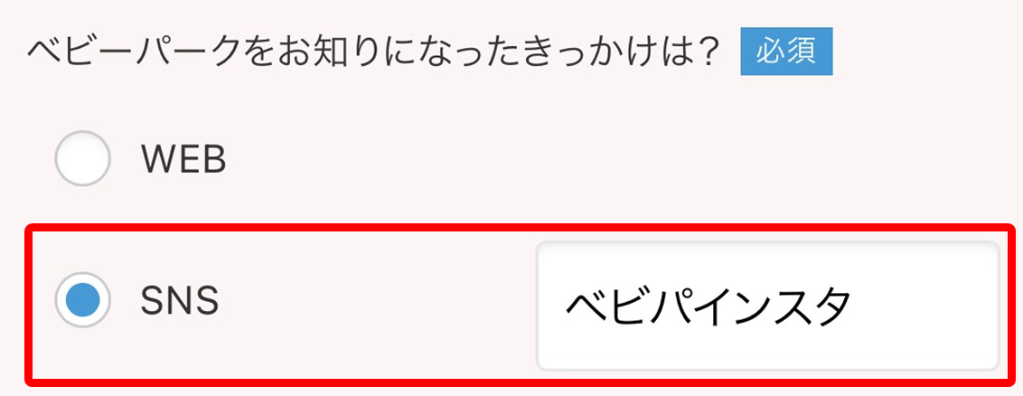 「ベビーパークをお知りになったきっかけ」欄で、SNSを選択し、「ベビパインスタ」と記入