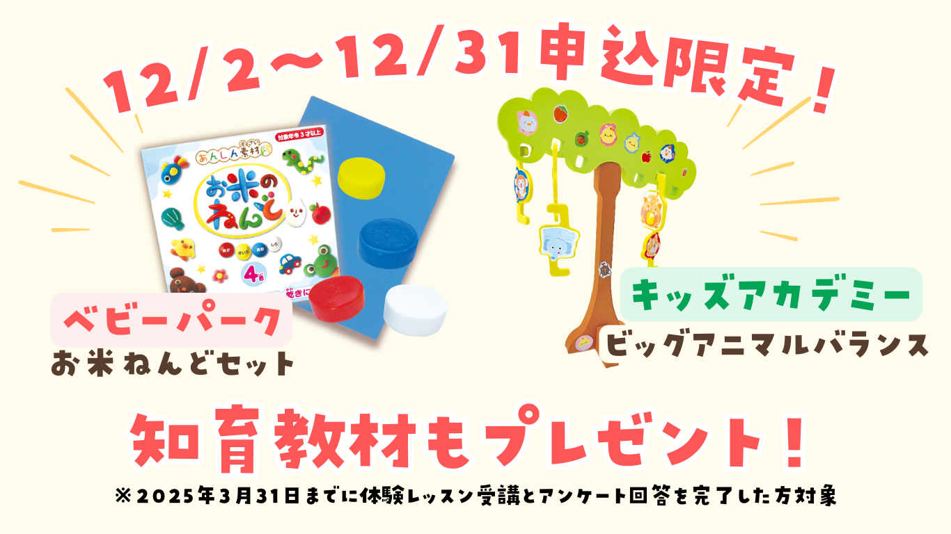 2024年12月2日~12月31日に下記の手順で体験レッスンをお申込し、2025年3月31日までに体験レッスン受講とアンケート回答を完了した方に下記の知育教材もプレゼント!